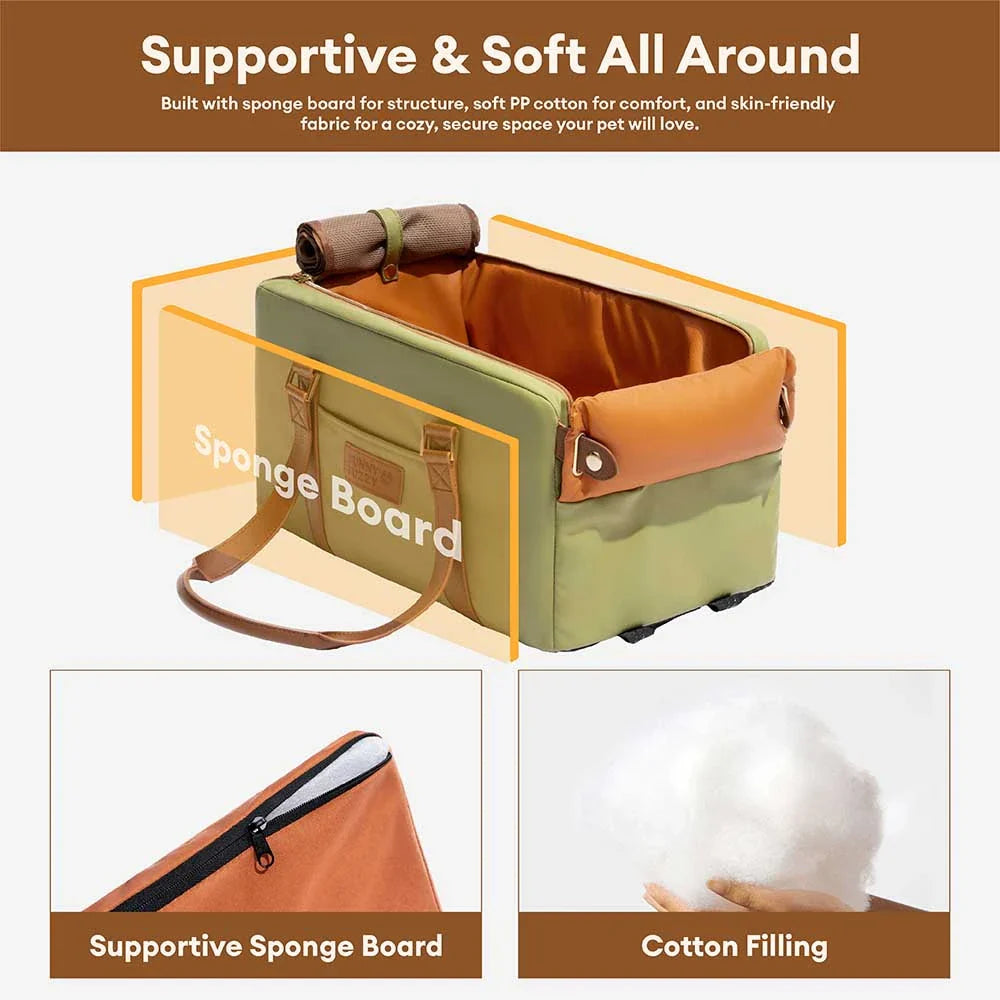 All-in-One Travel Design: Functions as a secure center console seat and seamlessly transforms into a handheld carrier or trolley sleeve bag—ideal for car rides, city strolls, or flights. Thoughtfully sized to meet most airline pet carrier requirements.